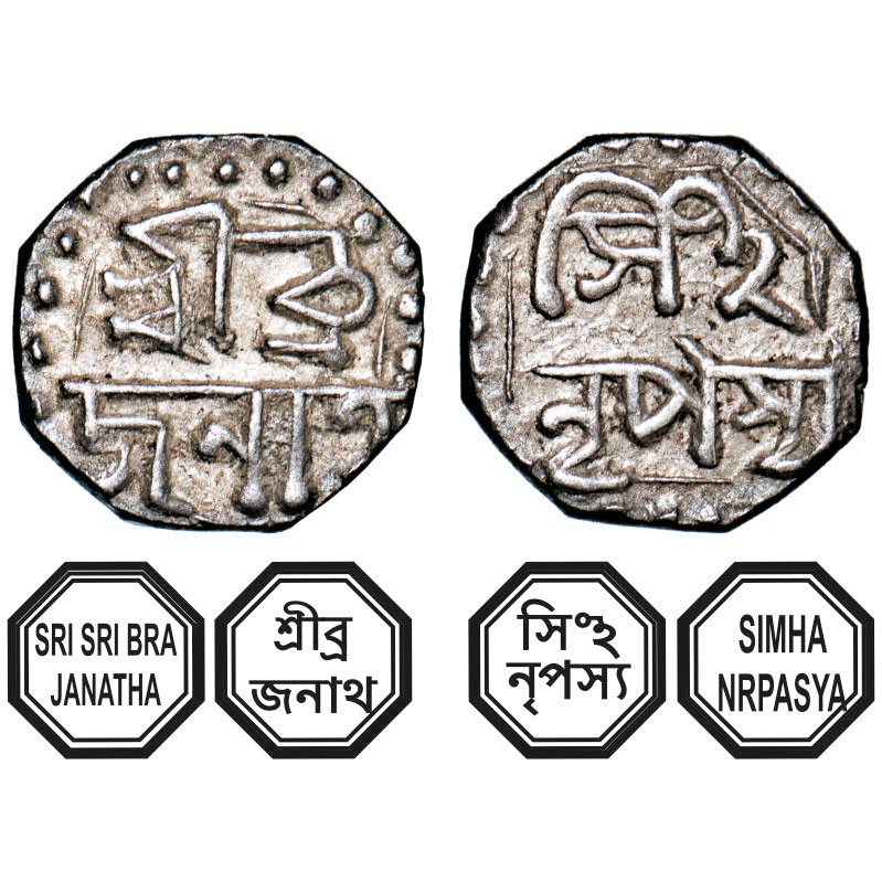 | Assam, Octagonal Silver 1/16 Rupee, 0.78g, Brajnatha Simha (1817/18-1819), undated, Assamese legends in two lines bold legends, Obv: Sri Bra/janatha, Rev: Simha/ Nrpasya. Reverse die perfectly struck at 6 o'clock. (A.Mitra. 457, RB. T 16.1 type). Extremely Fine, Rare. |