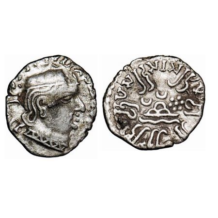 | Western Kshatrapas, Kardamaka Dynasty, Rudrasena I, son of Rudrasimha I, Silver Drachma, 1.26g, 14.57x12.97mm, Obv: Bust of king facing right, date behind, corrupt Greek legend around, Rev: Three arched hill with crescent in centre, moon to left and sun to right, Brahmi legend in Prakrit 'Rajno Mahakshatrapasa Rudrasihasaputrasa Rajno Mahakshatrapasa Rudrasenasa'. A.Fishman 13.2a. About Very Fine, Rare. |