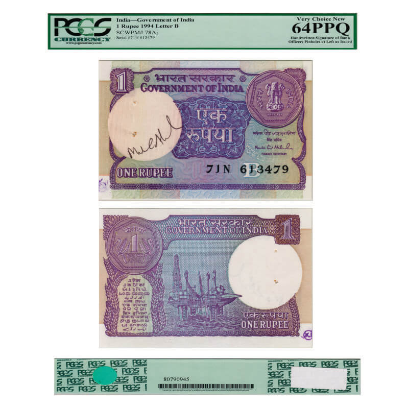 | Republic of India, 1 Rupee,1994, Signed by Montek Singh Ahluwalia (Finance Secretary), Serial No 71N 613479, Inset 'B', with actual handwritten in English, autograph on the note, personaly verified by the grader with Reserve Bank Of India. SCWPM#78Aj, IPM J&R 6.1.10.6D. PCGS graded Very Choice New 64 PPQ. Rare. |