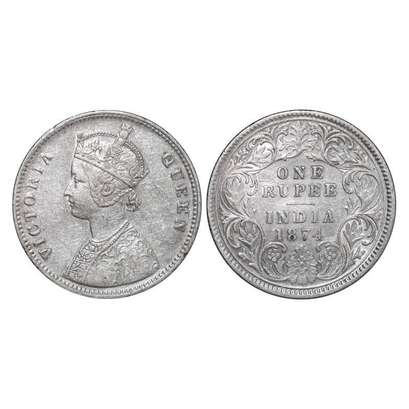 Victoria Queen, Silver, Rupee, 1874, Calcutta Mint, A1/I, No mint mark. GK 418. Very Fine. Scarce.