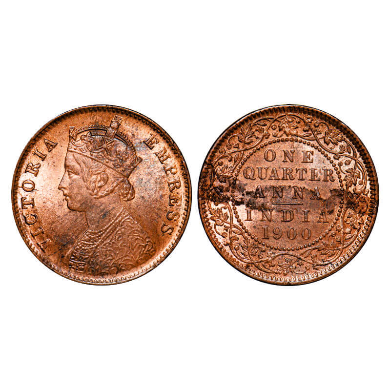 | Victoria Empress, Copper, Quarter Anna, 1900, Calcutta Mint, B/II, No mint mark, Die crack on Obv and Rev, Planchet flaw on Rev, Struck through Error on Obv. GK 859. Uncirculated, Details. Scarce. |