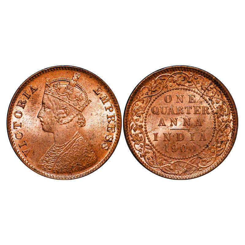 Victoria Empress, Copper, Quarter Anna, 1900, Calcutta Mint, B/II, No mint mark, Die crack on Rev. GK 859. Mint State. Very Scarce.