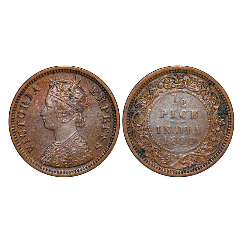 Victoria Empress, Copper, 1/2 Pice, 1890, Calcutta Mint, A/I, No mint mark. GK 870. Extremely Fine+. Scarce.
