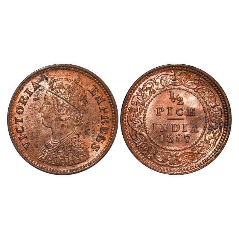 Victoria Empress, Copper, 1/2 Pice, 1897, Calcutta Mint, A/I, No mint mark. GK 877. Uncirculated, Cleaned. Very Scarce.