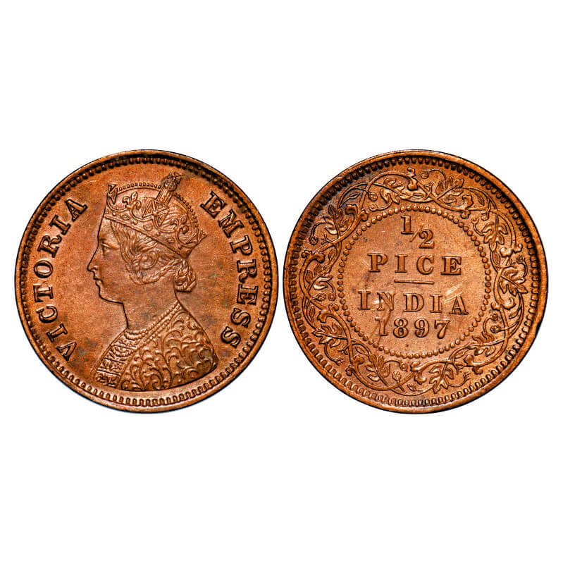 Victoria Empress, Copper, 1/2 Pice, 1897, Calcutta Mint, A/I, No mint mark. GK 877. Extremely Fine. Scarce.