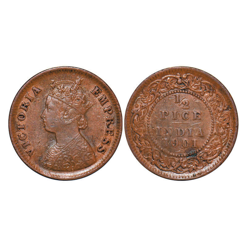 Victoria Empress, Copper, 1/2 Pice, 1901, Calcutta Mint, A/I, No mint mark, Complete ghost on Rev. ...