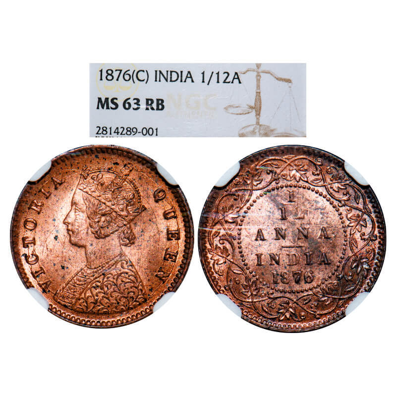 Victoria Empress, Copper, 1/12 Anna, 1876, Calcutta Mint, Obv A, No mint mark. GK 888. NGC MS 63 RB. Very Rare.