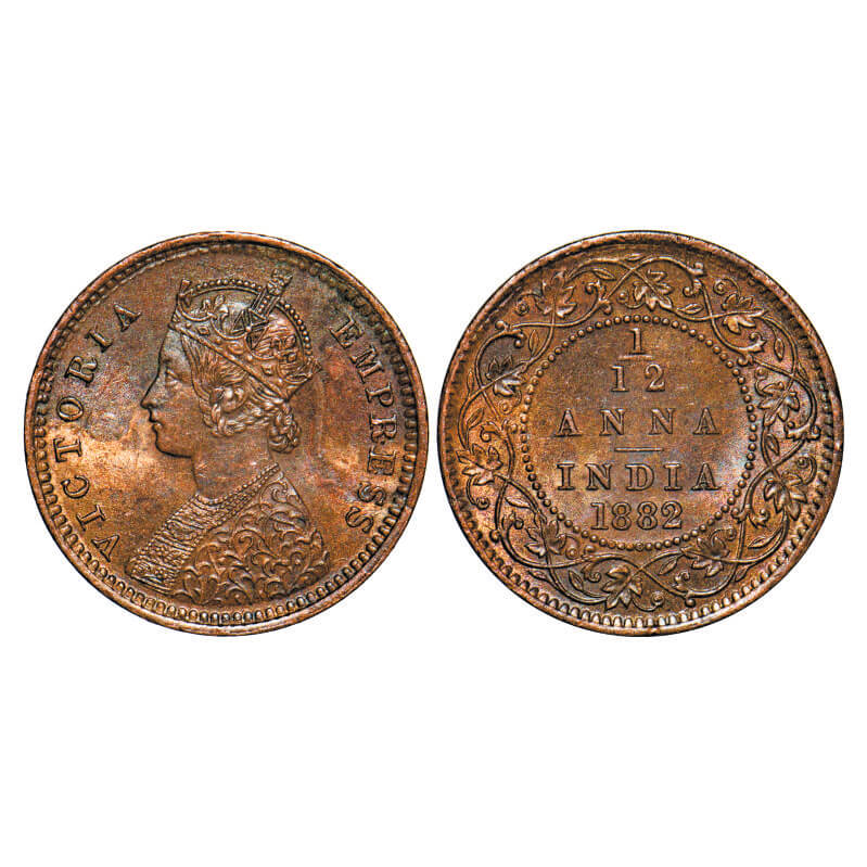Victoria Empress, Copper, 1/12 Anna, 1882, Calcutta Mint, Obv B, 'C' incused. GK 893. Almost Uncirculated. Very Scarce.