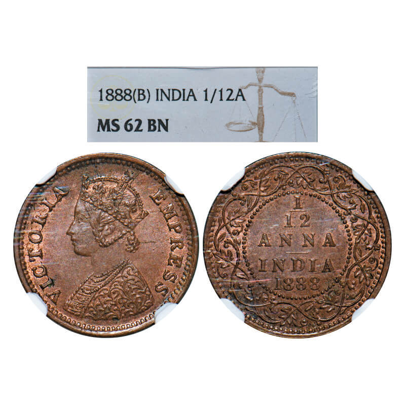 Victoria Empress, Copper, 1/12 Anna, 1888, Bombay Mint, Obv A, No mint mark. GK 907. NGC Slabbed MS 62 BN. Rare.