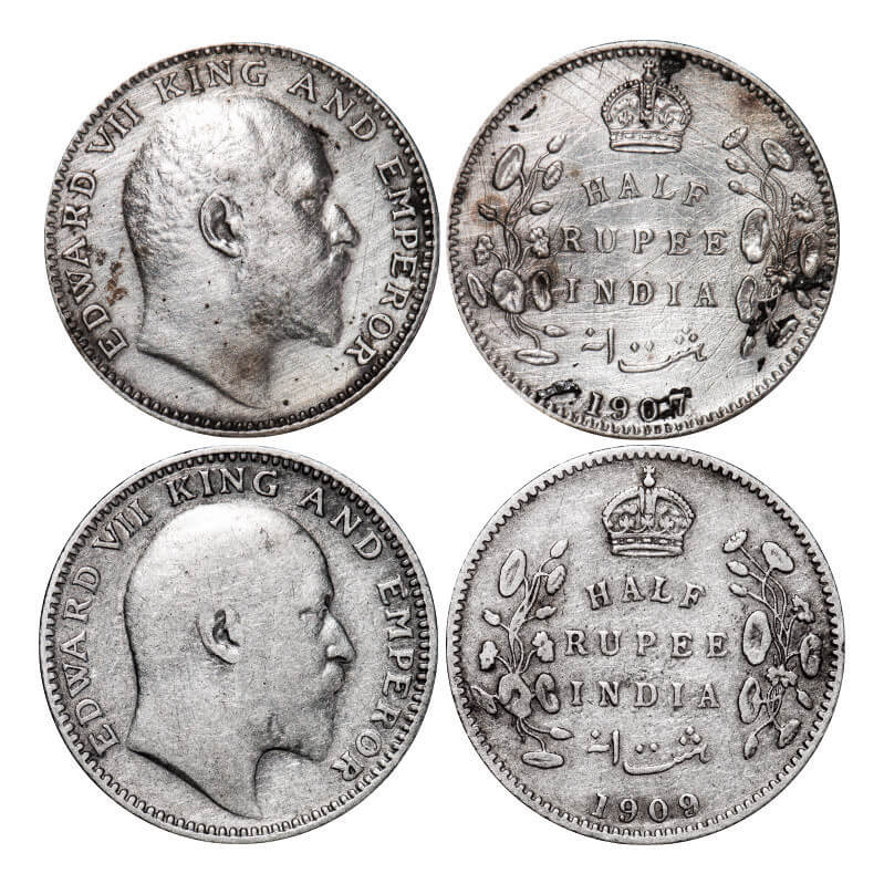 | Edward VII, Silver, Half Rupee, (2 coins), 1) 1907, Bombay Mint, 'B' incused and dot, Scratches on Rev, 2) 1909, Calcutta Mint, No mint mark. GK 965, 969. Extremely Fine, Cleaned to Very Fine. Scarce. |