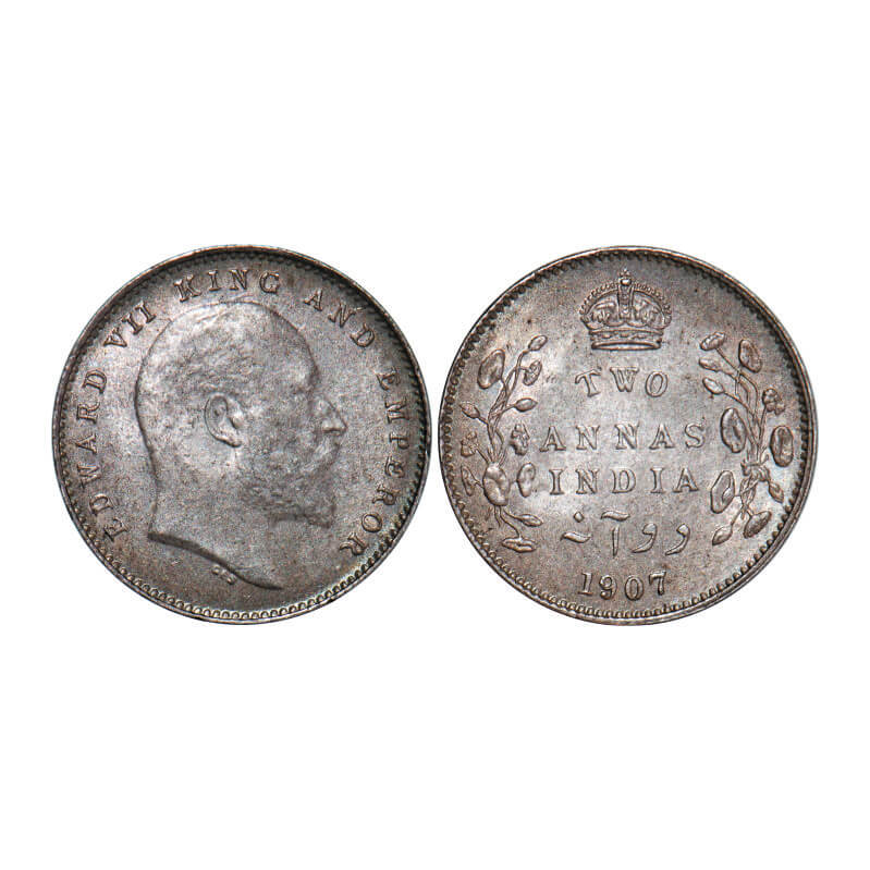 Edward VII, Silver, 2 Annas, 1907, Calcutta Mint, No mint mark. GK 984. About Uncirculated. Scarce.