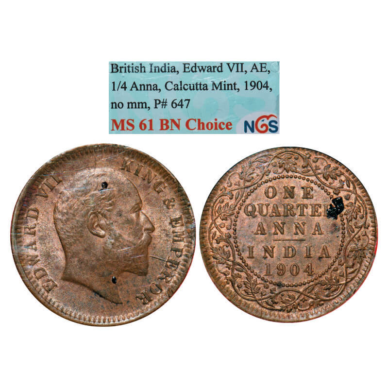 Edward VII, Copper, Quarter Anna, 1904, Calcutta Mint, No mint mark. GK 995. NGS Slabbed MS 61 BN. Scarce.