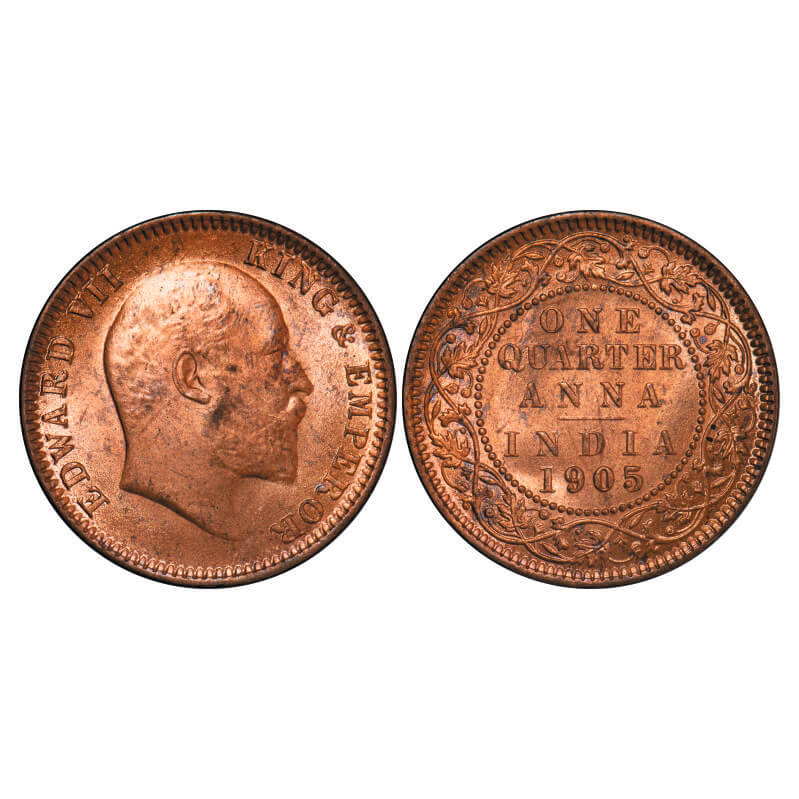 Edward VII, Copper, Quarter Anna, 1905, Calcutta Mint, No mint mark, Die crack on obv. GK 996. Brilliant Uncirculated. Scarce.