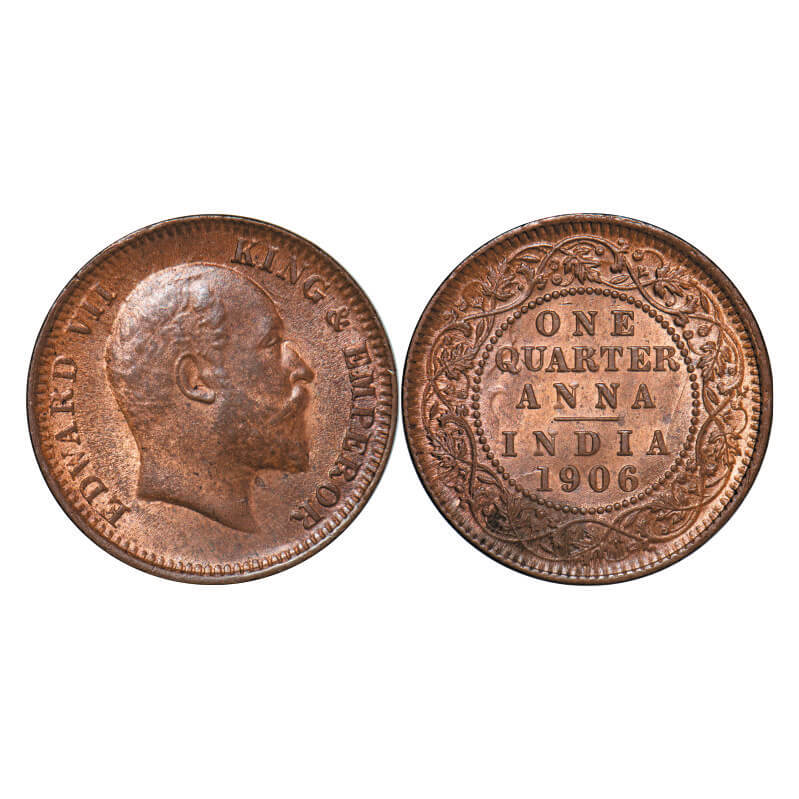 Edward VII, Copper, Quarter Anna, 1906, (6.42g), Calcutta Mint, No mint mark, Ghost on Rev. GK 997. Uncirculated. Scarce.