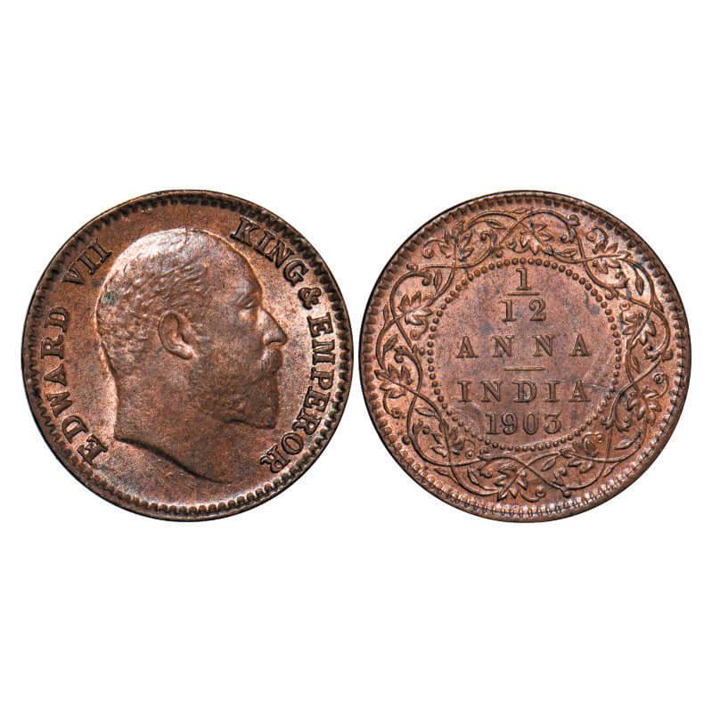 Edward VII, Copper, 1/12 Anna, 1903, Calcutta Mint, No mint mark, Die crack on Obv. GK 1012. Uncirculated. Scarce.