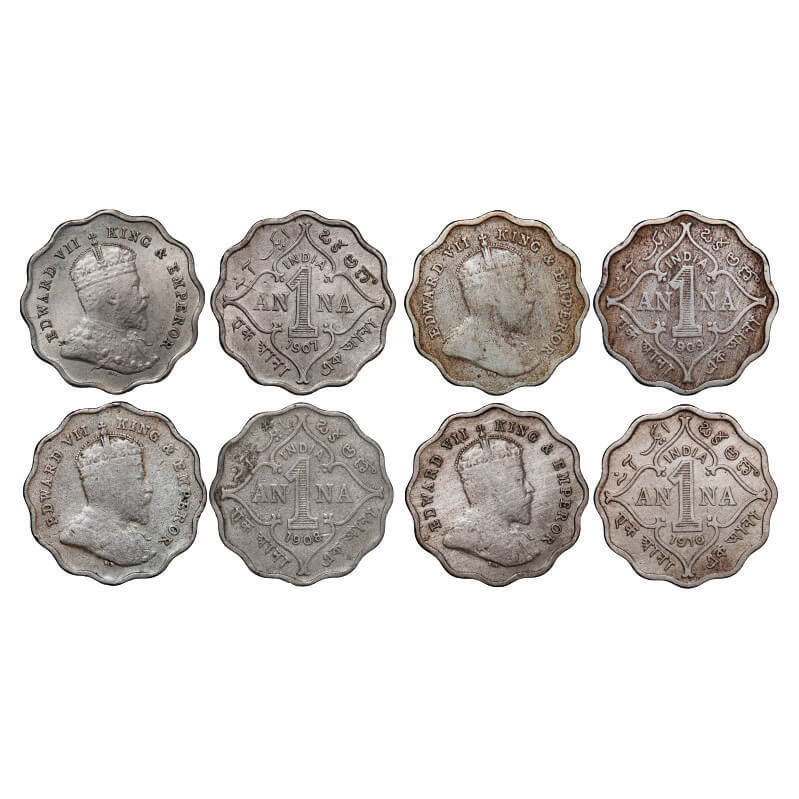 | Edward VII, Copper-Nickel, 1 Anna, (4 coins), 1907, 1908, 1909, 1910, Bombay Mint, 'B' incused. GK 990, 991, 992, 993. Fine+ to Extremely Fine. Scarce as a lot. |