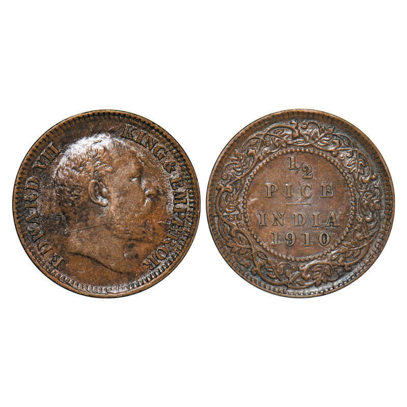 Edward VII, Bronze, 1/2 Pice 1910, Calcutta Mint, No mint mark, Ghost on Rev, Die crack on Obv and Rev. GK 1011. About Uncirculated. Scarce.