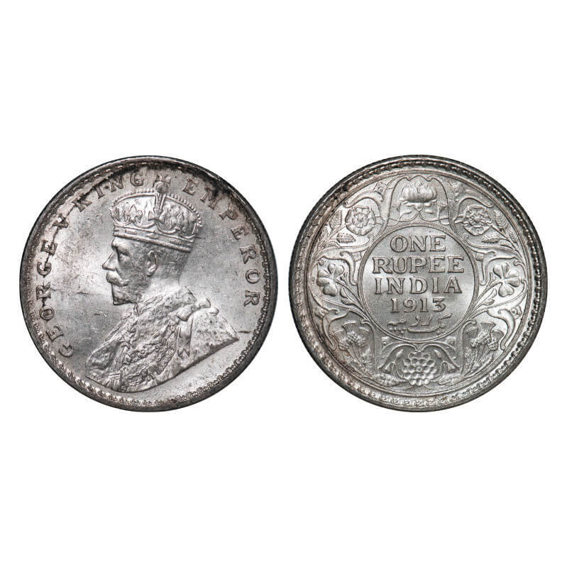 George V, Silver, Rupee, 1913, Calcutta Mint, No dot, Ghost on Rev. GK 1027. Mint State. Scarce.