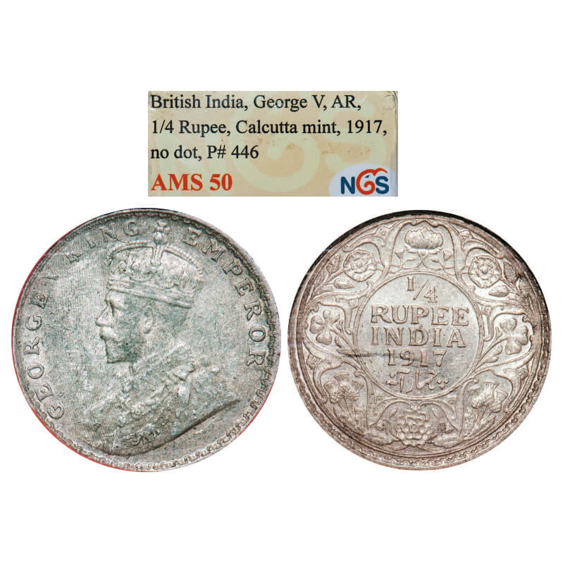 George V, Silver, Rupee, 1917, Calcutta Mint, No dot. GK 1035. NGS Slabbed AMS 50. Scarce.