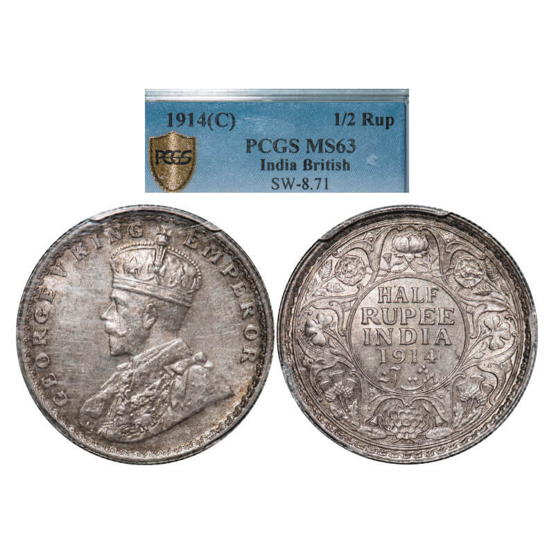 George V, Silver, Half Rupee, 1914, Calcutta Mint, No dot. GK 1050. PCGS Slabbed MS 63. Very Scarce.