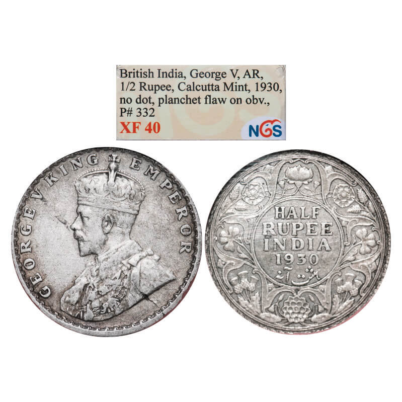 George V, Silver, Half Rupee, 1930, Calcutta Mint, No dot, Slab indicates planchet flaw on Obv. GK 1072. NGS Slabbed XF 40. Scarce.