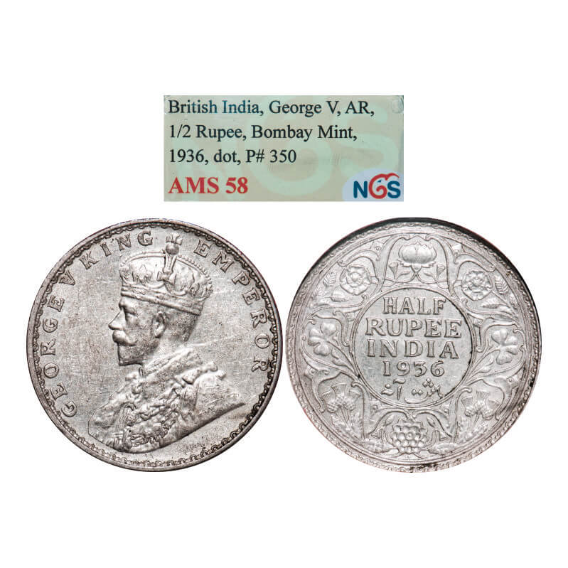 George V, Silver, Half Rupee, 1936, Bombay Mint, Dot. GK 1076. NGS Slabbed AMS 58. Scarce.