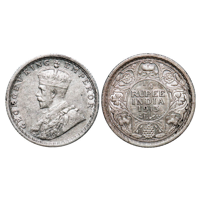 George V, Silver, 1/4 Rupee, 1913, Calcutta Mint, No dot. GK 1083. About Uncirculated. Scarce.