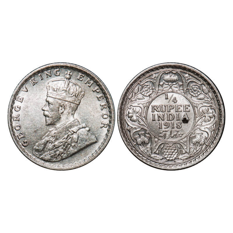 George V, Silver, 1/4 Rupee, 1918, Calcutta Mint, No dot. GK 1091. Extremely Fine. Scarce....