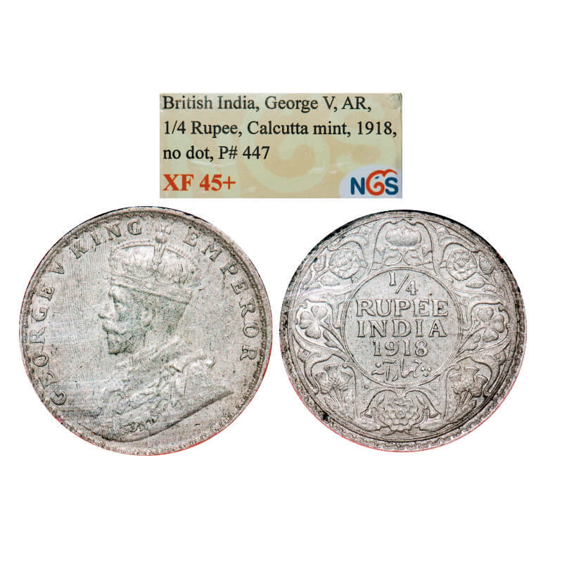 George V, Silver, 1/4 Rupee, 1918, Calcutta mint, No dot. GK 1091. NGS Slabbed XF 45+. Scarce.