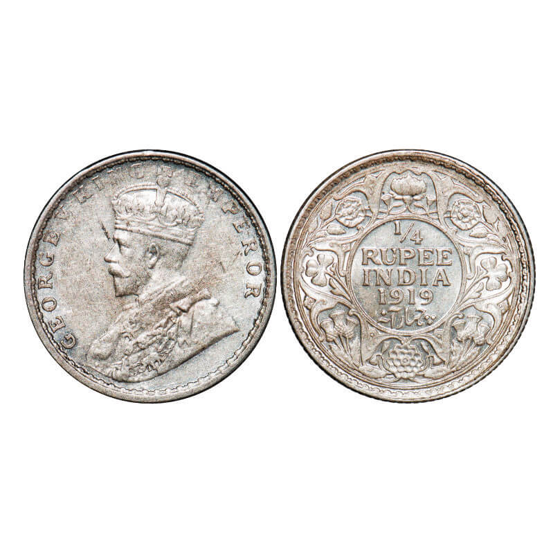 George V, Silver, 1/4 Rupee, 1919, Calcutta Mint, No dot. GK 1092. About Uncirculated. Scarce.