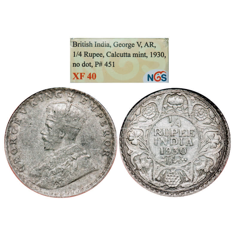 George V, Silver, 1/4 Rupee, 1930, Calcutta Mint, No dot. GK 1097. NGS Slabbed XF 40. Scarce.