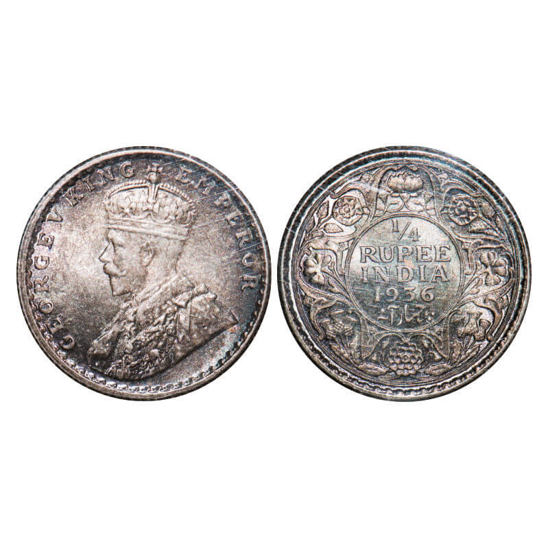 George V, Silver, 1/4 Rupee, 1936, Calcutta Mint, No dot. GK 1099. Brilliant Uncirculated, Toned. Scarce.