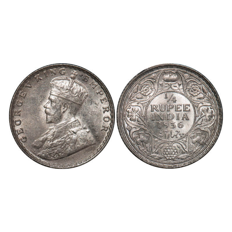 George V, Silver, 1/4 Rupee, 1936, Bombay Mint, Dot. GK 1100. Uncirculated. Scarce.