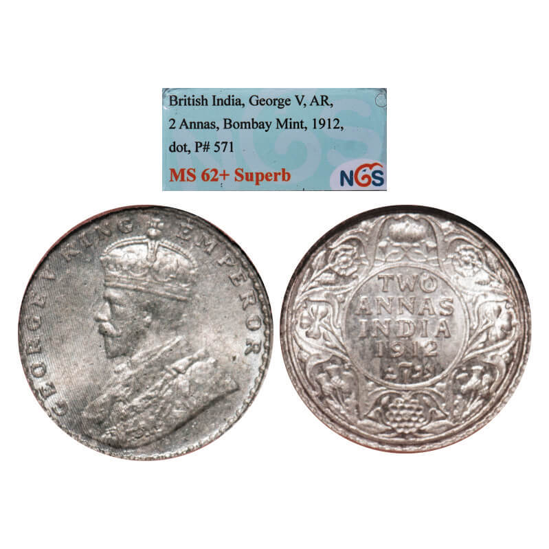 George V, Silver, 2 Annas, 1912, Bombay Mint, Dot. GK 1109. NGS Slabbed MS 62+, Superb. Very Scarce.