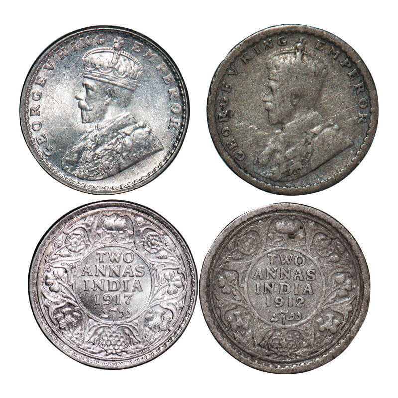 | George V, Silver, 2 Annas, (2 coins), 1) 1912, Bombay Mint, Dot, 2) 1917, Calcutta Mint, No dot. GK 1109, 1117. Very Fine+ to Uncirculated. Scarce. |