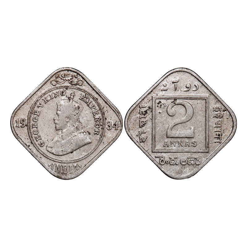 George V, Copper-Nickel, 2 Annas, 1934, Calcutta Mint, No dot. GK 1137. Fine. Scarce....