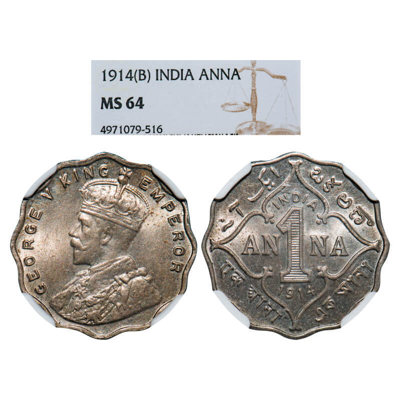 George V, Copper-Nickel, 1 Anna, 1914, Bombay Mint, No dot. GK 1144. NGC Slabbed MS 64. Rare.