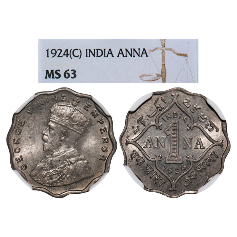 George V, Copper-Nickel, 1 Anna, 1924, Calcutta mint, No dot. GK 1153. NGC Slabbed MS 63. Very Scarce.
