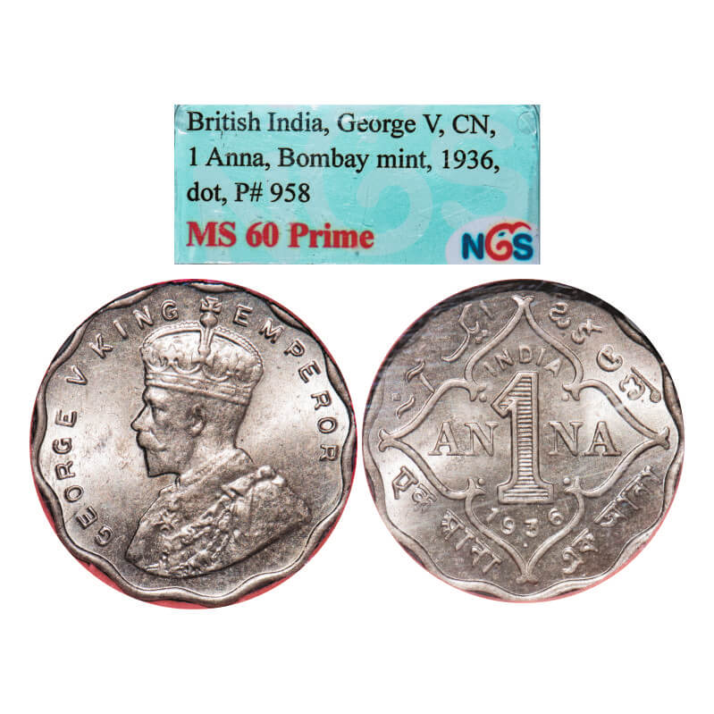 George V, Copper-Nickel, 1 Anna, 1936, Bombay Mint, Dot, Small dot. GK 1168. NGS Slabbed MS 60 Prime. Scarce.