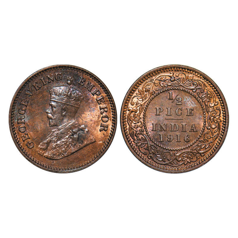 George V, Bronze, 1/2 Pice, 1916, Calcutta Mint, No mint mark. GK 1202. Brilliant Uncirculated. Scarce.