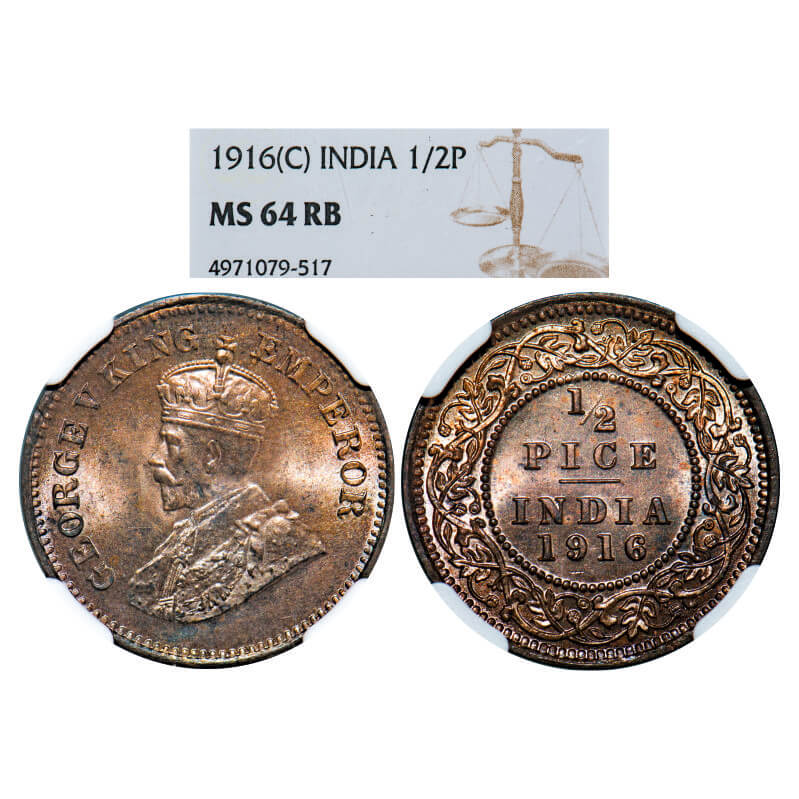 George V, Bronze, 1/2 Pice, 1916, Calcutta Mint, No mint mark. GK 1202. NGC Slabbed MS 64 RB. Rare.