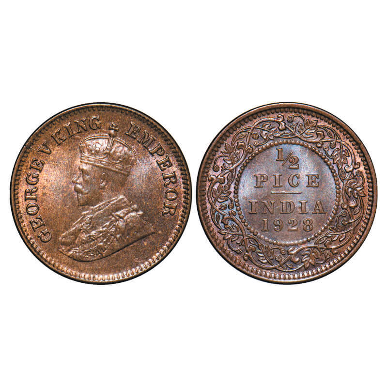 George V, Bronze, 1/2 Pice, 1928, Calcutta Mint, No mint mark, Ghost on Rev, die cracks on Obv. GK 1214. Brillaint Uncirculated. Very scarce.
