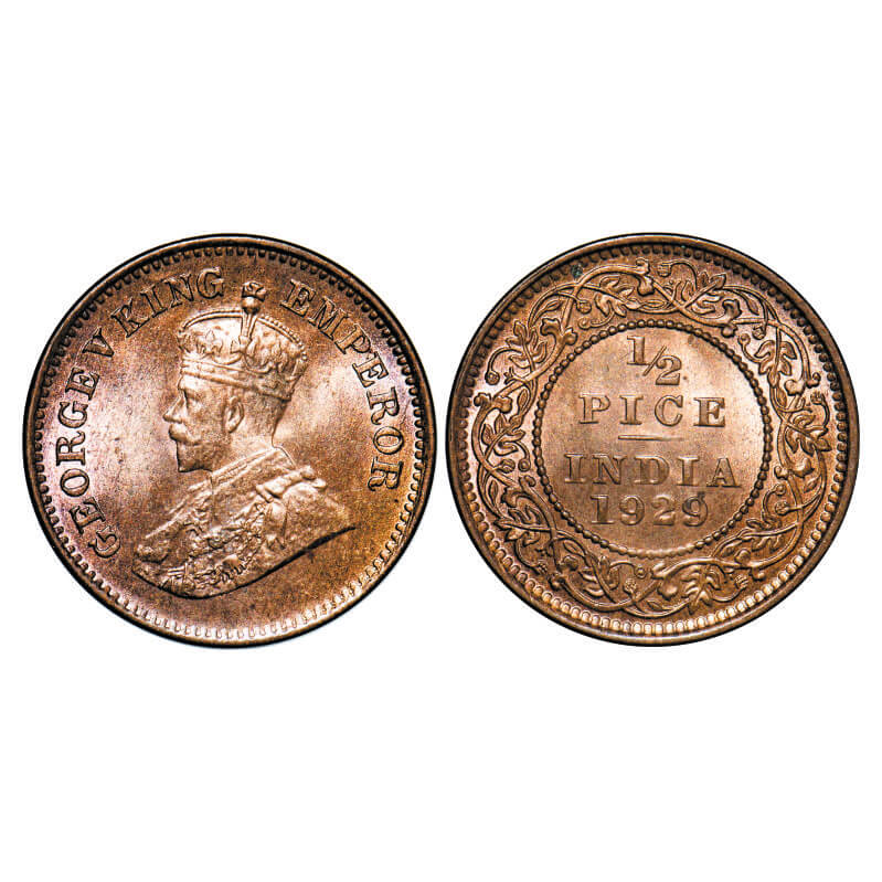George V, Bronze, 1/2 Pice, 1929, Calcutta Mint, No mint mark. GK 1215. Mint State. Very Scarce.