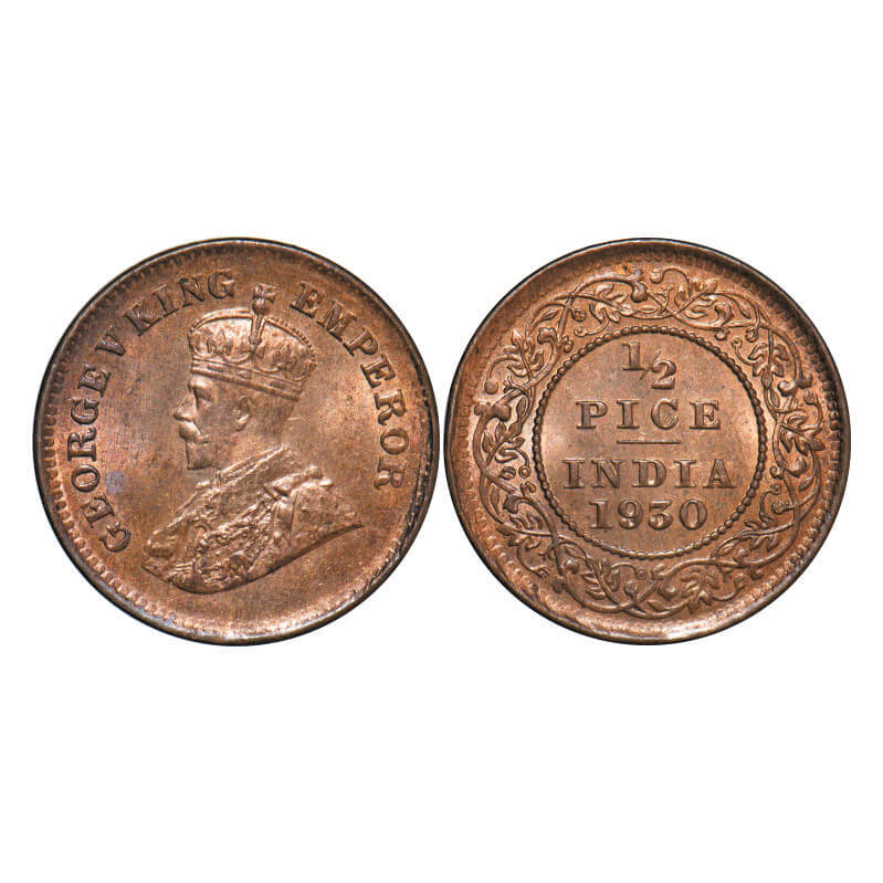George V, Bronze, 1/2 Pice, 1930, Calcutta Mint, No mint mark. GK 1216. Brilliant Uncirculated. Scarce.