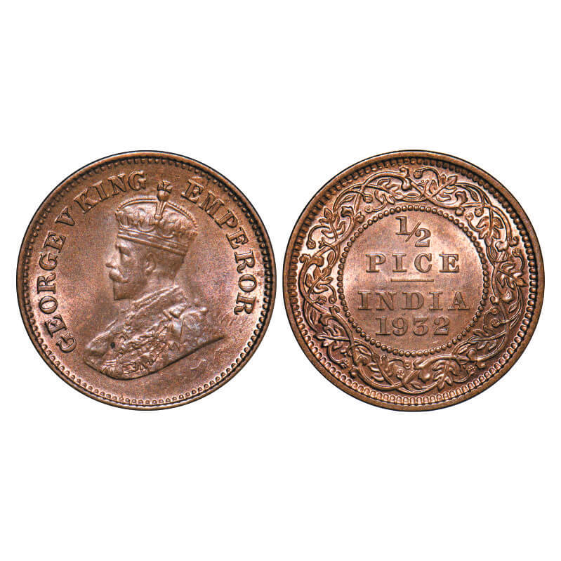 George V, Bronze, 1/2 Pice, 1932, Calcutta Mint, No mint mark. GK 1218. Mint State. Very Scarce.