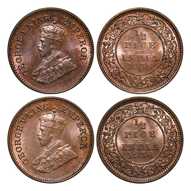 | George V, Bronze, 1/2 Pice, (2 coins), 1936, Calcutta Mint, No mint mark, 1) Numeral 1,9,3,6 of year date 1936 is thinner compare to normal 1936, 2) Normal year date 1936. GK Unlisted GK, 1222. |