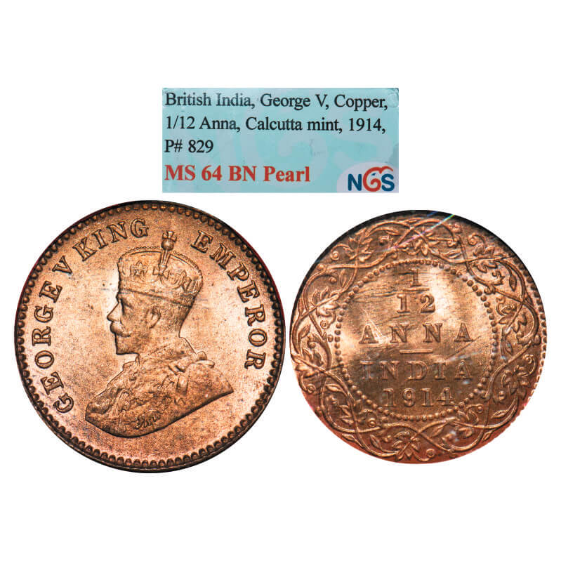 George V, Bronze, 1/12 Anna, 1914, Calcutta Mint, No dot. GK 1225. NGS Slabbed MS 64 BN, Pearl. Rare.