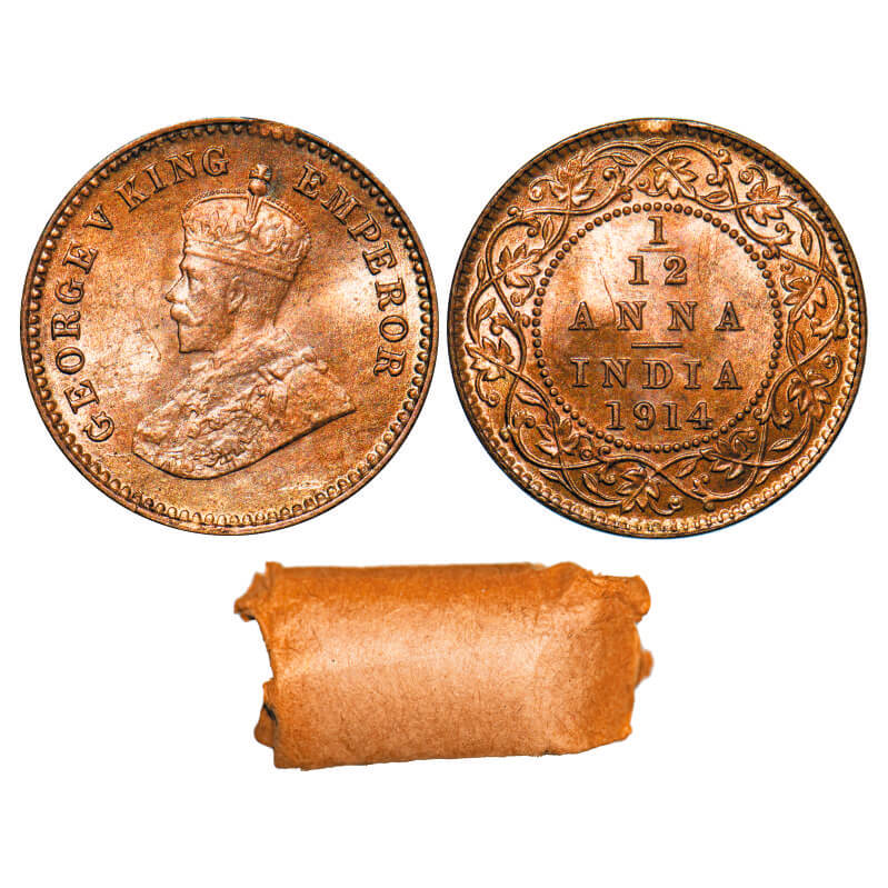 George V, Bronze, 1/12 Anna, 1914, Calcutta mint, No dot. 24 Uncirculated coins in a brown paper roll. GK 1225. Scarce.