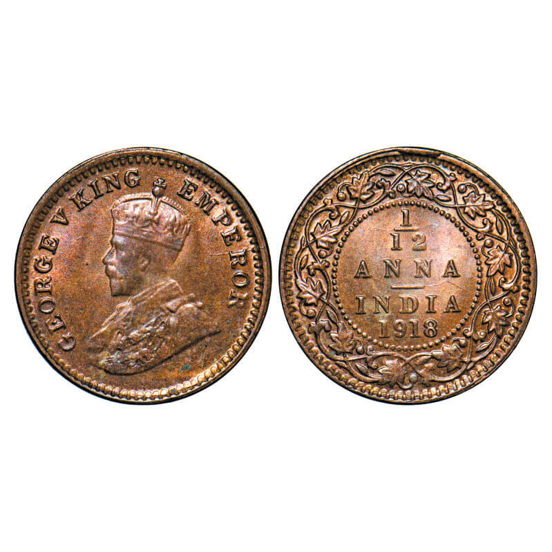 George V, Bronze, 1/12 Anna, 1918, Calcutta Mint, No dot, Multiple die cracks on Obv and Rev, Cud on Rev rim edge. GK 1229. Uncirculated. Scarce.