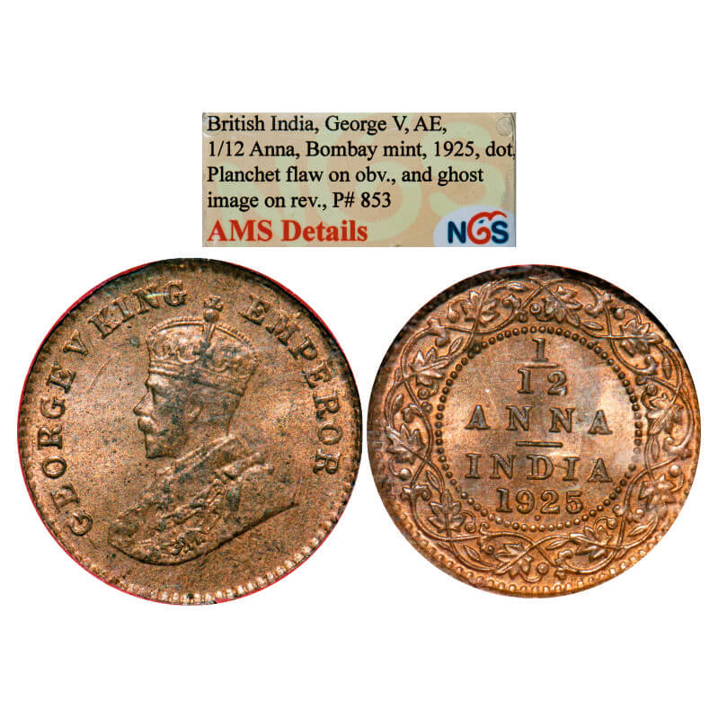 George V, Bronze, 1/12 Anna, 1925, Bombay Mint, Dot, Planchet flaw on Obv and Ghost image on Rev is indicated on Slab. GK 1237. NGS Slabbed AMS, Details. Scarce.